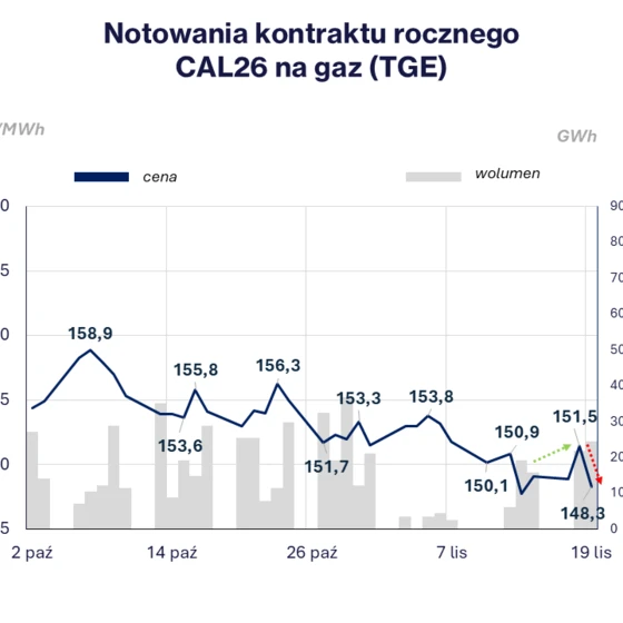 Na przestrzeni ostatniego tygodnia notowania kontraktu CAL26 na polskiej TGE oscylowały w przedziale 148,25-151,45 PLN/MWh.