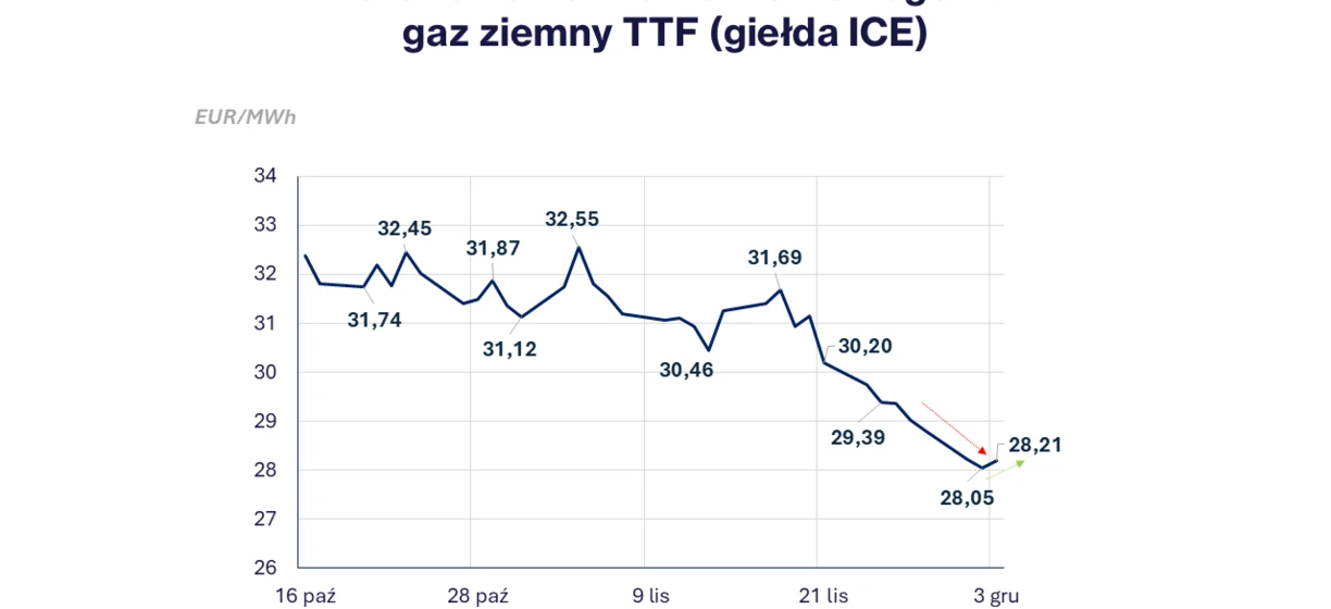 Na przestrzeni ostatniego tygodnia notowania gazu (JAN26) charakteryzowały się przeważającą tendencją spadkową. Od zeszłego piątku (28.11) do obecnego wtorku (02.12) ceny spadły z poziomu 28,82 EUR/MWh do 28,05 EUR/MWh. Powodem było utrzymanie zadowalającego poziomu importu LNG do Europy oraz prognozy cieplejszej od oczekiwań, drugiej połowy grudnia w Europie.