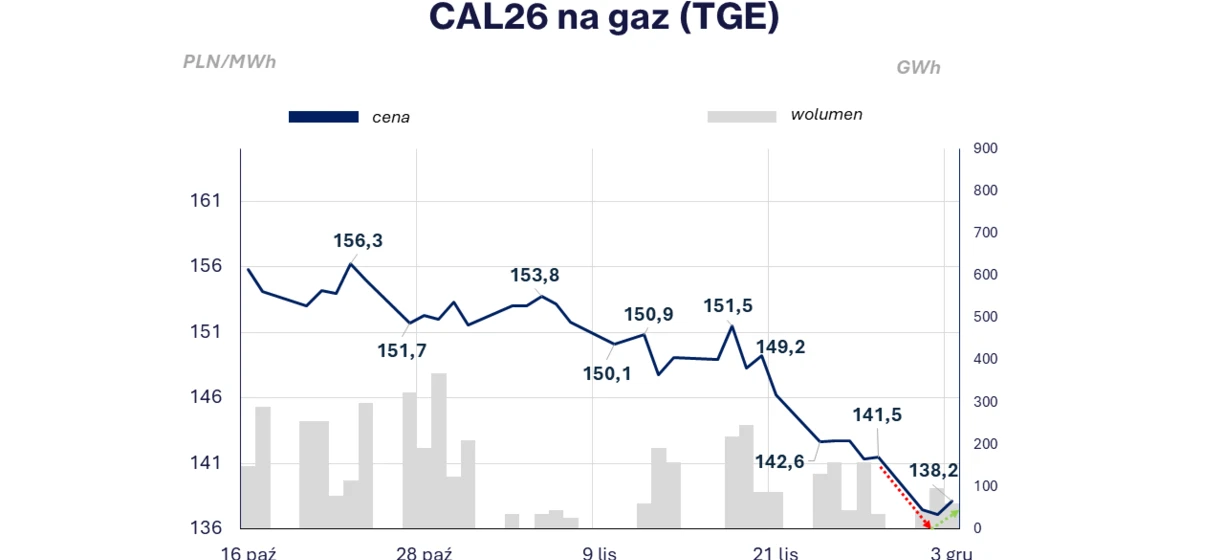 Pod koniec zeszłego tygodnia notowania kontraktu CAL26 na polskiej TGE kierowały się tendencją spadkową, dochodząc do najniższego poziomu we wtorek (02.12) wynoszącego 137,13 PLN/MWh. Następnie ceny wzrosły do 138,15 PLN/MWh wczoraj (03.12).